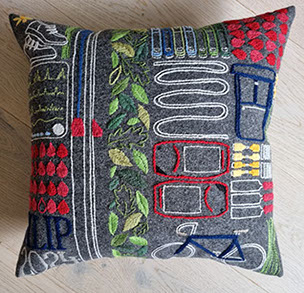 Första broderade kudden med motiv från trädgården.